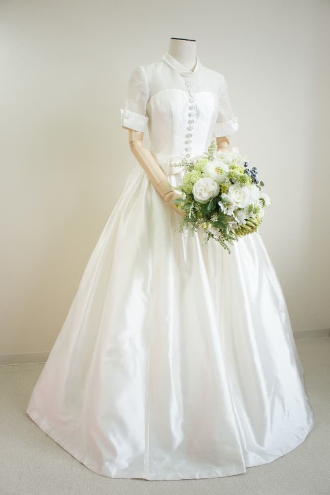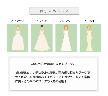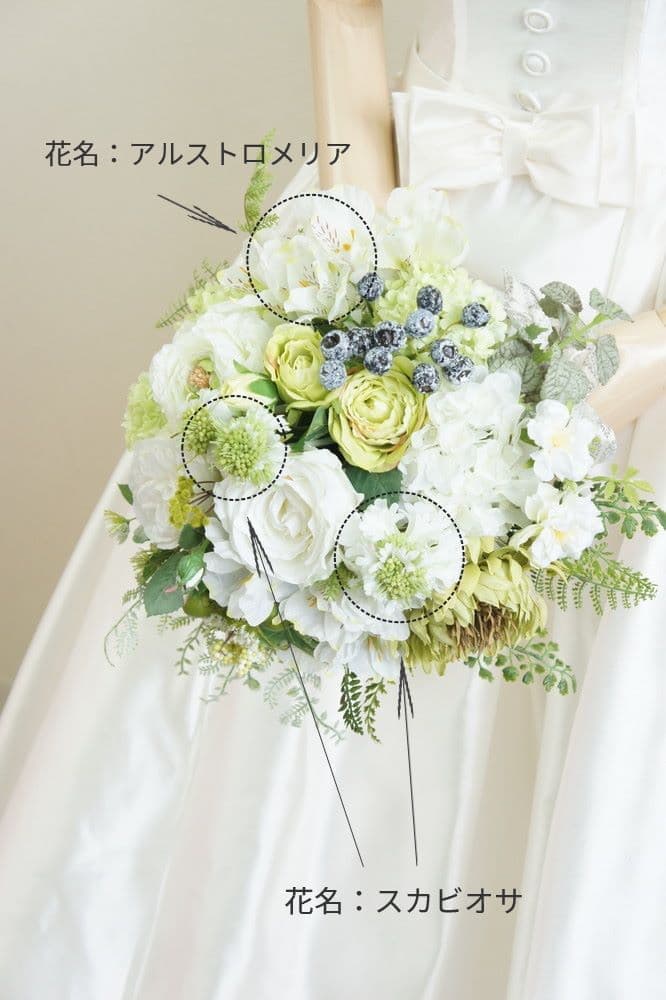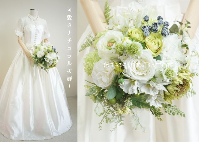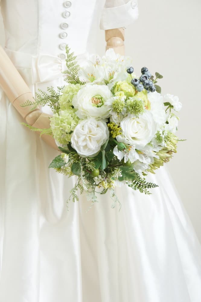 | 印象 | 緑と白のボタニカル溢れるクラッチタイプのブーケは、ブルーベリーや青りんごでスタイリッシュ過ぎない甘さを♪細やかな印象がキュートなポイント♡スレンダーなドレスやマーメイドドレスにはちょっと崩した感じでラフに持つことで今どきの印象を強調!コーディネートの幅が広がる定番人気のブーケです。 |