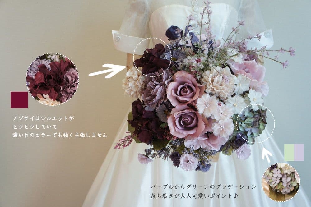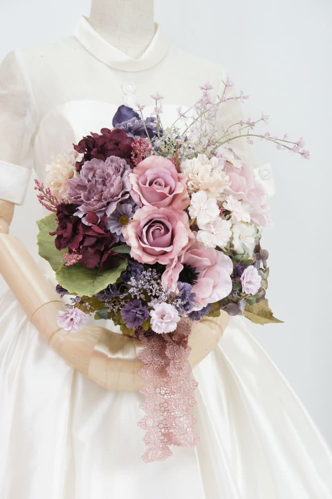 ピンクベージュからモードなパープルのカラー。シックな可愛らしさの中にある大人のブーケです。光の具合で黒っぽくもピンクっぽくもなる、見せ方次第のブーケです。楽しめるカラーは様々なドレスに合わせてみてください。