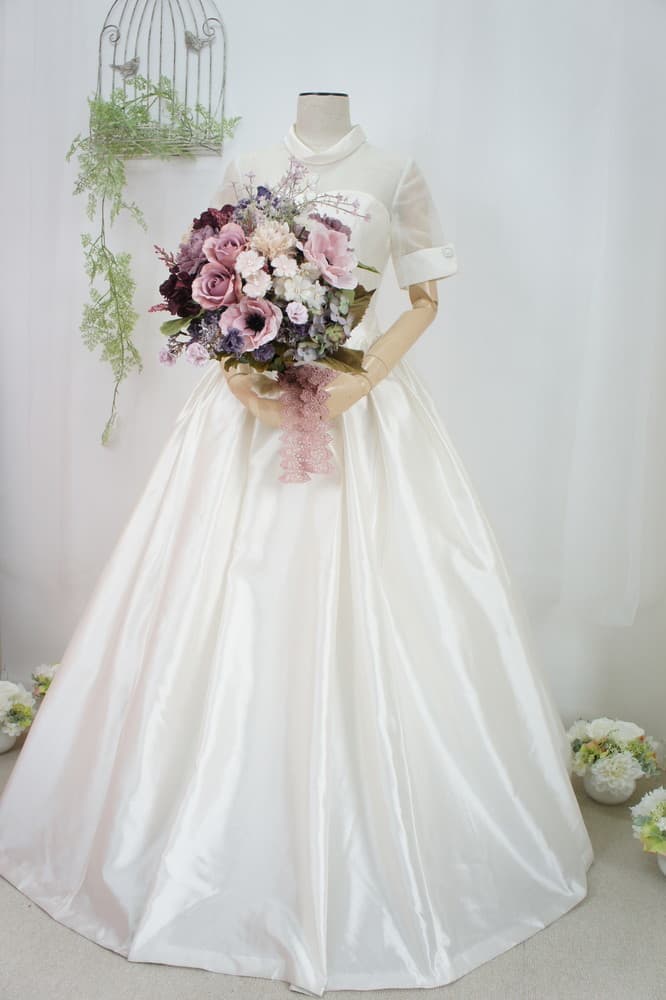 | 印象 | ピンクベージュからモードなパープルのカラー。シックな可愛らしさの中にある大人のブーケです。光の具合で黒っぽくもピンクっぽくもなる、見せ方次第のブーケです。楽しめるカラーは様々なドレスに合わせてみてください。 |
