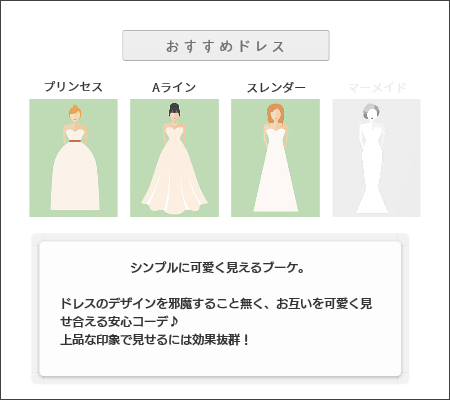 | 印象 | 大人気のこだわったキラキラディテールの白いバラが、一層目を引くウェディングドレスの華やかさをアップします。大きくても重さを感じさせない印象がキレイめ花嫁におすすめ。意外と人気なエーデルワイスは中央の星形のお花で、単純になりがちなまぁるいブーケにアクセントをプラス!ドレスとのバランスを取りやすい大きさもお気に入り♡ |